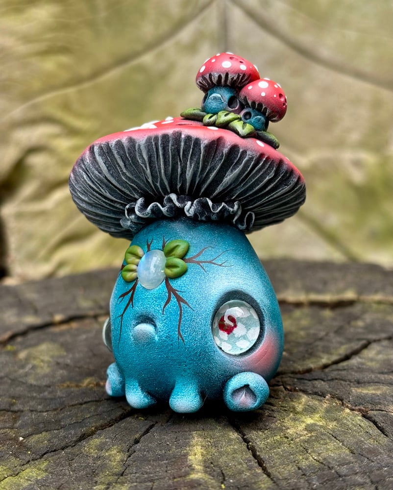 • Mushroom handmade by me in polymer clay and painted, sealed, with handmade glass eyes.